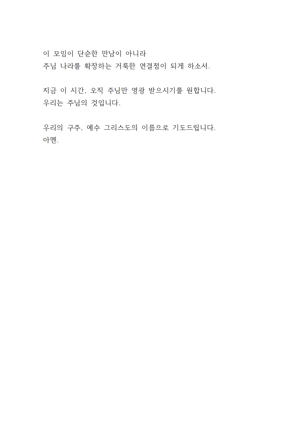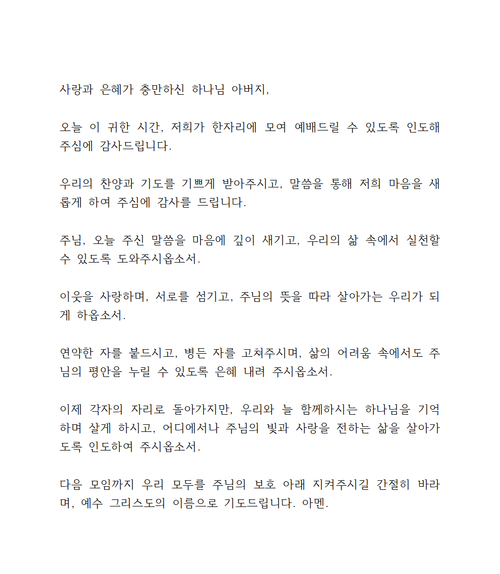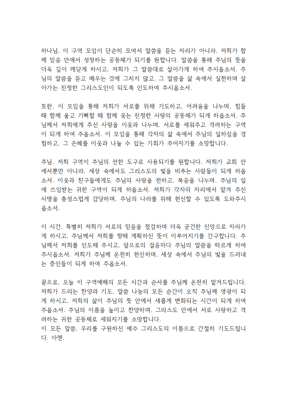 끝으로, 오늘 이 구역예배의 모든 시간과 순서를 주님께 온전히 맡겨드립니다. 저희가 드리는 찬양과 기도, 말씀 나눔의 모든 순간이 오직 주님께 영광이 되게 하시고, 저희의 삶이 주님의 뜻 안에서 새롭게 변화되는 시간이 되게 하여 주옵소서. 주님의 이름을 높이고 찬양하며, 그리스도 안에서 서로 사랑하고 격려하는 귀한 공동체로 세워지기를 소망합니다.