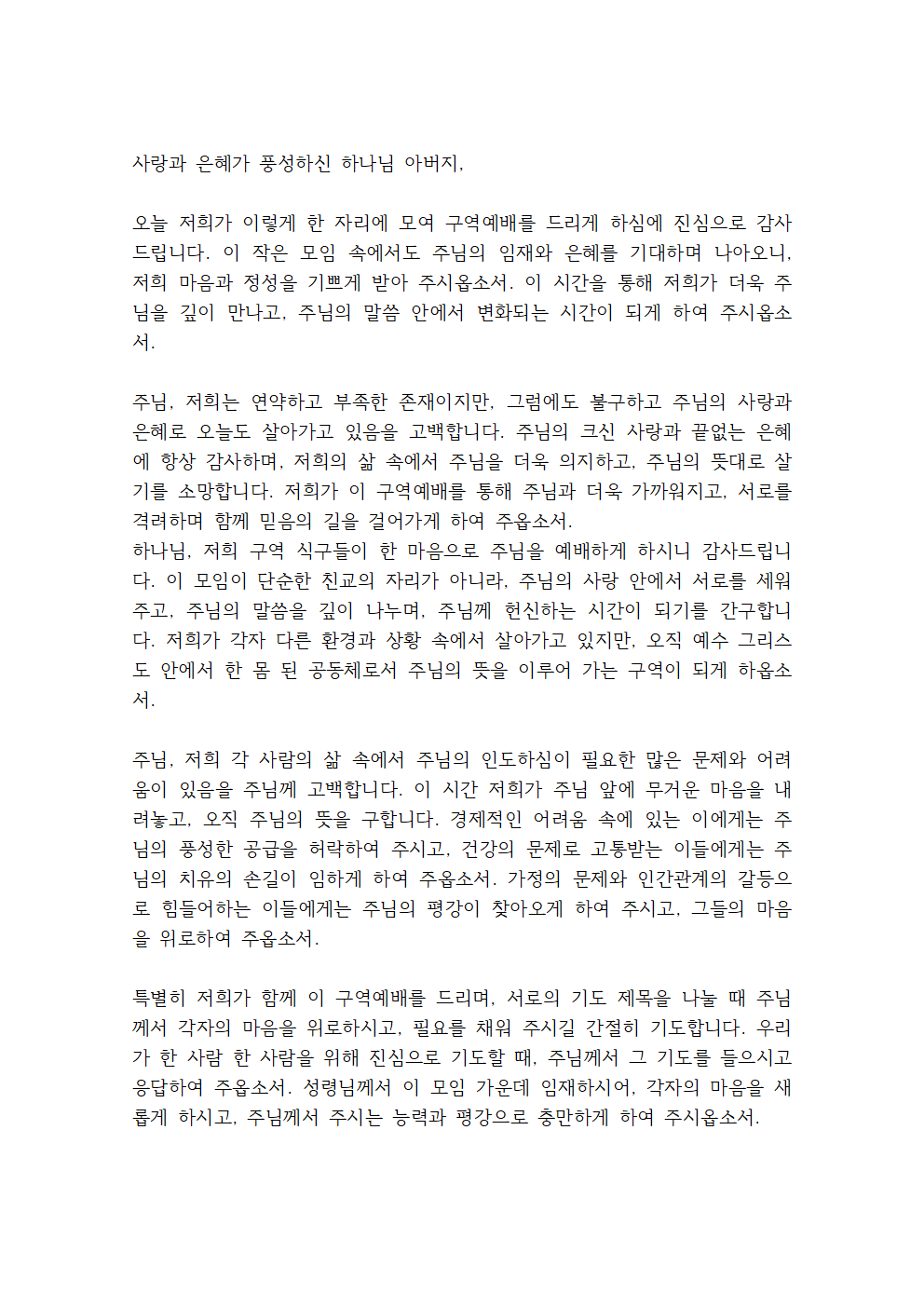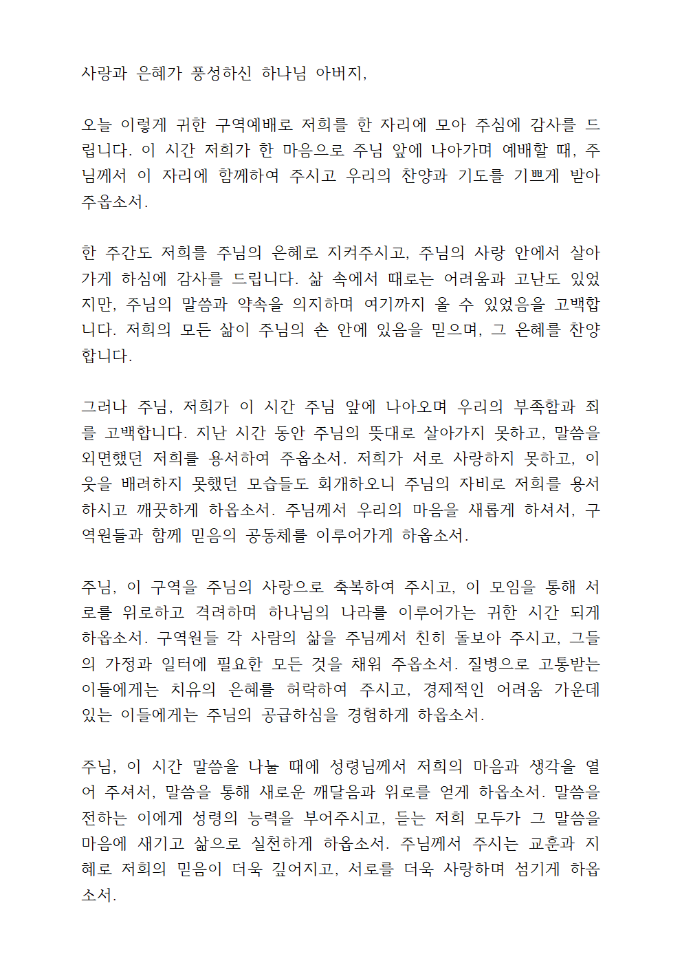 주님, 저희는 연약하고 부족한 존재이지만, 그럼에도 불구하고 주님의 사랑과 은혜로 오늘도 살아가고 있음을 고백합니다. 주님의 크신 사랑과 끝없는 은혜에 항상 감사하며, 저희의 삶 속에서 주님을 더욱 의지하고, 주님의 뜻대로 살기를 소망합니다. 저희가 이 구역예배를 통해 주님과 더욱 가까워지고, 서로를 격려하며 함께 믿음의 길을 걸어가게 하여 주옵소서. 하나님, 저희 구역 식구들이 한 마음으로 주님을 예배하게 하시니 감사드립니다. 이 모임이 단순한 친교의 자리가 아니라, 주님의 사랑 안에서 서로를 세워 주고, 주님의 말씀을 깊이 나누며, 주님께 헌신하는 시간이 되기를 간구합니다. 저희가 각자 다른 환경과 상황 속에서 살아가고 있지만, 오직 예수 그리스도 안에서 한 몸 된 공동체로서 주님의 뜻을 이루어 가는 구역이 되게 하옵소서.