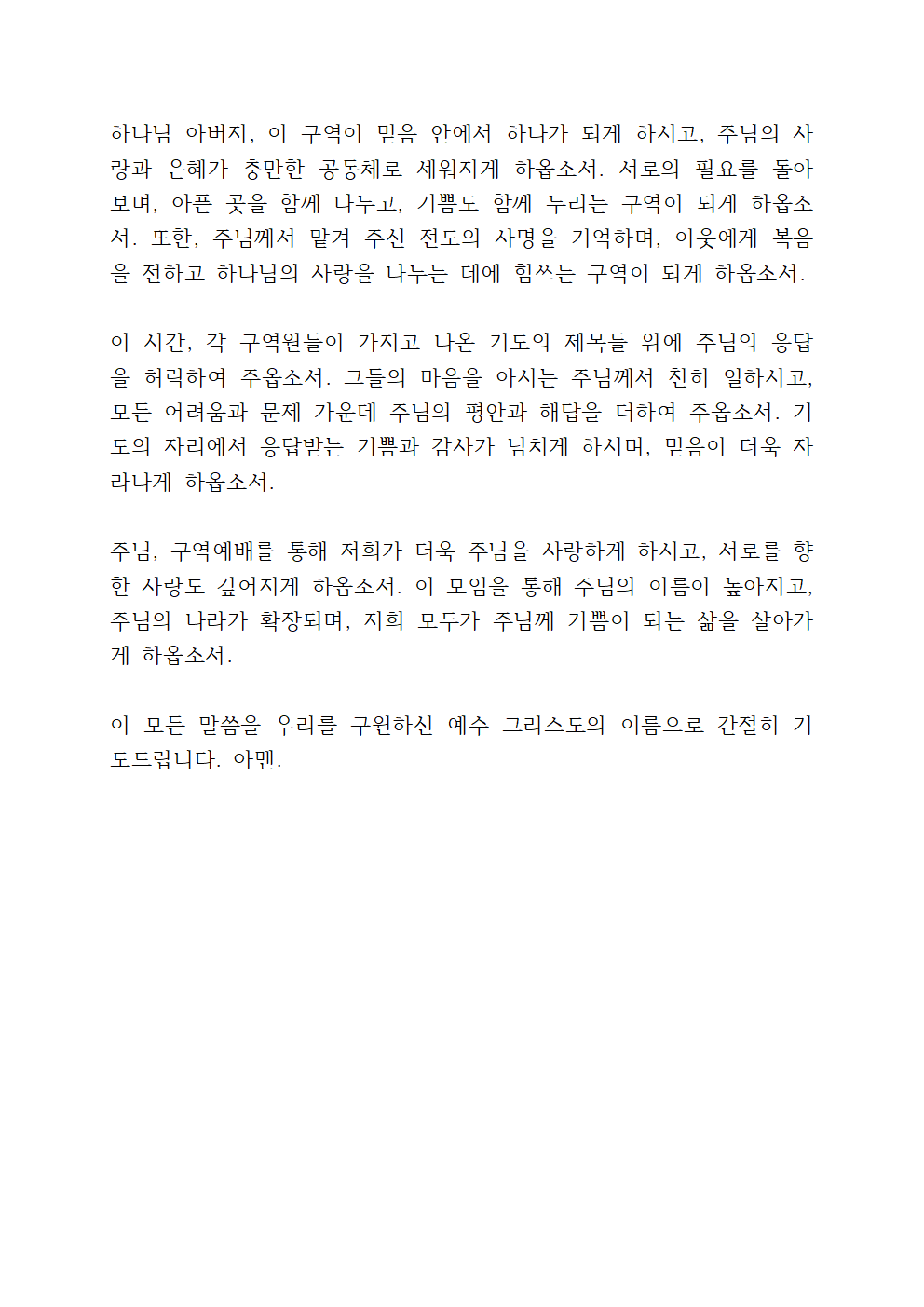또한, 이 모임을 통해 저희가 서로를 위해 기도하고, 어려움을 나누며, 힘들 때 함께 울고 기뻐할 때 함께 웃는 진정한 사랑의 공동체가 되게 하옵소서. 주님께서 저희에게 주신 사랑을 이웃과 나누며, 서로를 세워주고 격려하는 구역이 되게 하여 주옵소서. 이 모임을 통해 각자의 삶 속에서 주님의 일하심을 경험하고, 그 은혜를 이웃과 나눌 수 있는 기회가 주어지기를 소망합니다.