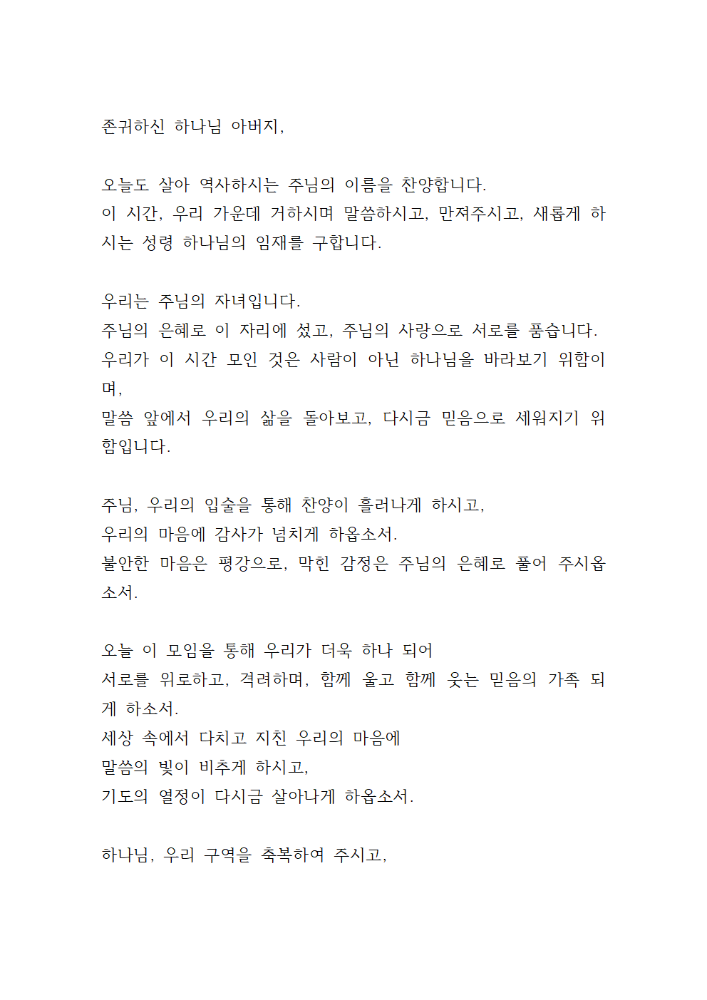 오늘 저희가 이렇게 한 자리에 모여 구역예배를 드리게 하심에 진심으로 감사드립니다. 이 작은 모임 속에서도 주님의 임재와 은혜를 기대하며 나아오니, 저희 마음과 정성을 기쁘게 받아 주시옵소서. 이 시간을 통해 저희가 더욱 주님을 깊이 만나고, 주님의 말씀 안에서 변화되는 시간이 되게 하여 주시옵소서.