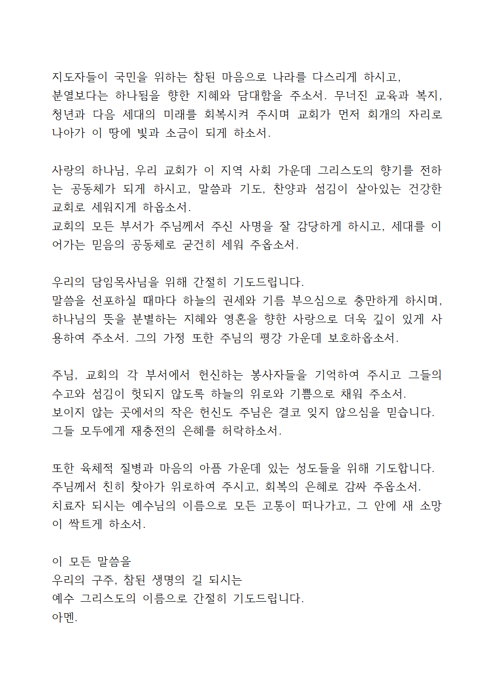 여러 가지 갈등과 혼란 속에서 주님의 정의와 평화가 흐르게 하시고, 지도자들에게는 지혜와 공의를, 국민들에게는 사랑과 용서를 허락하여 주옵소서.