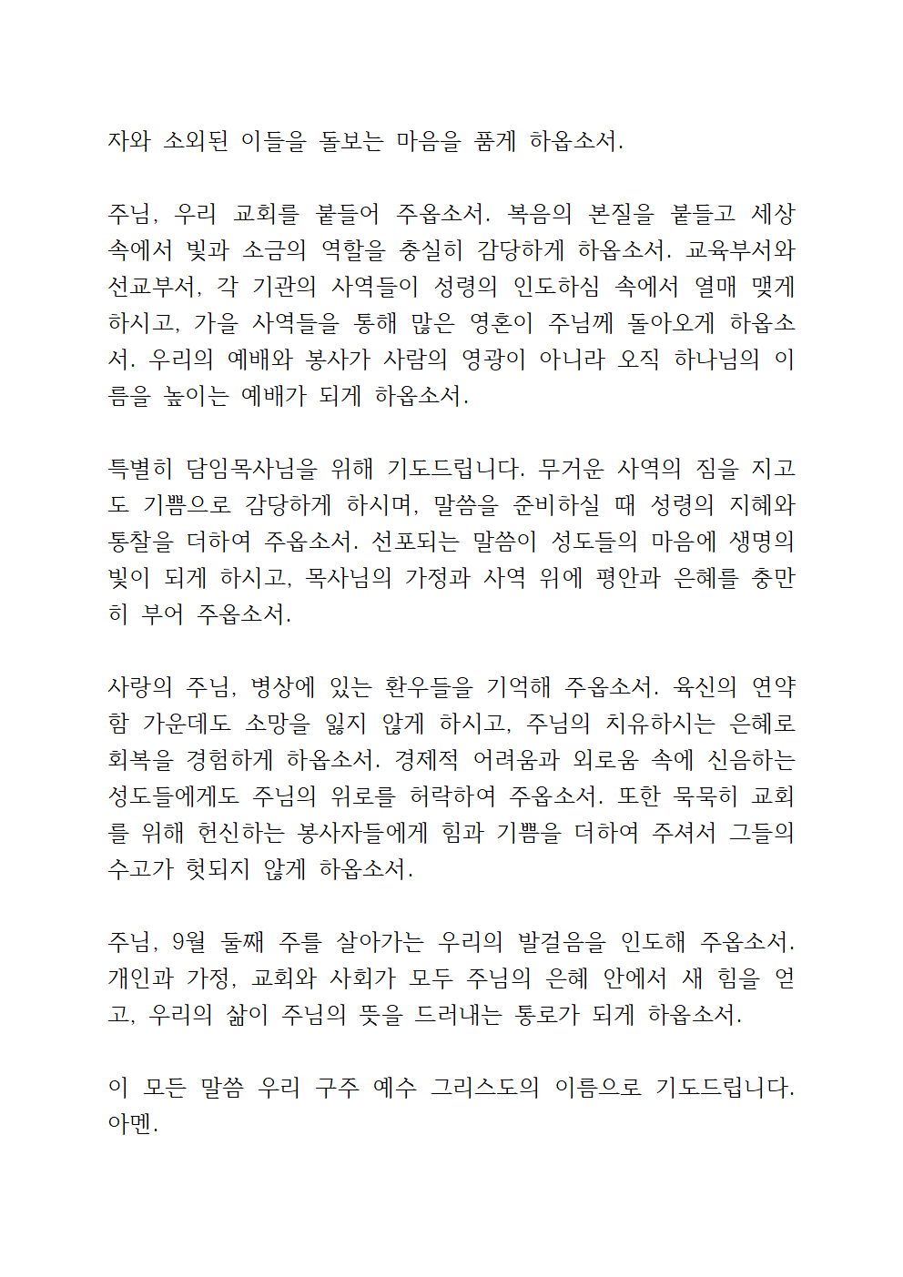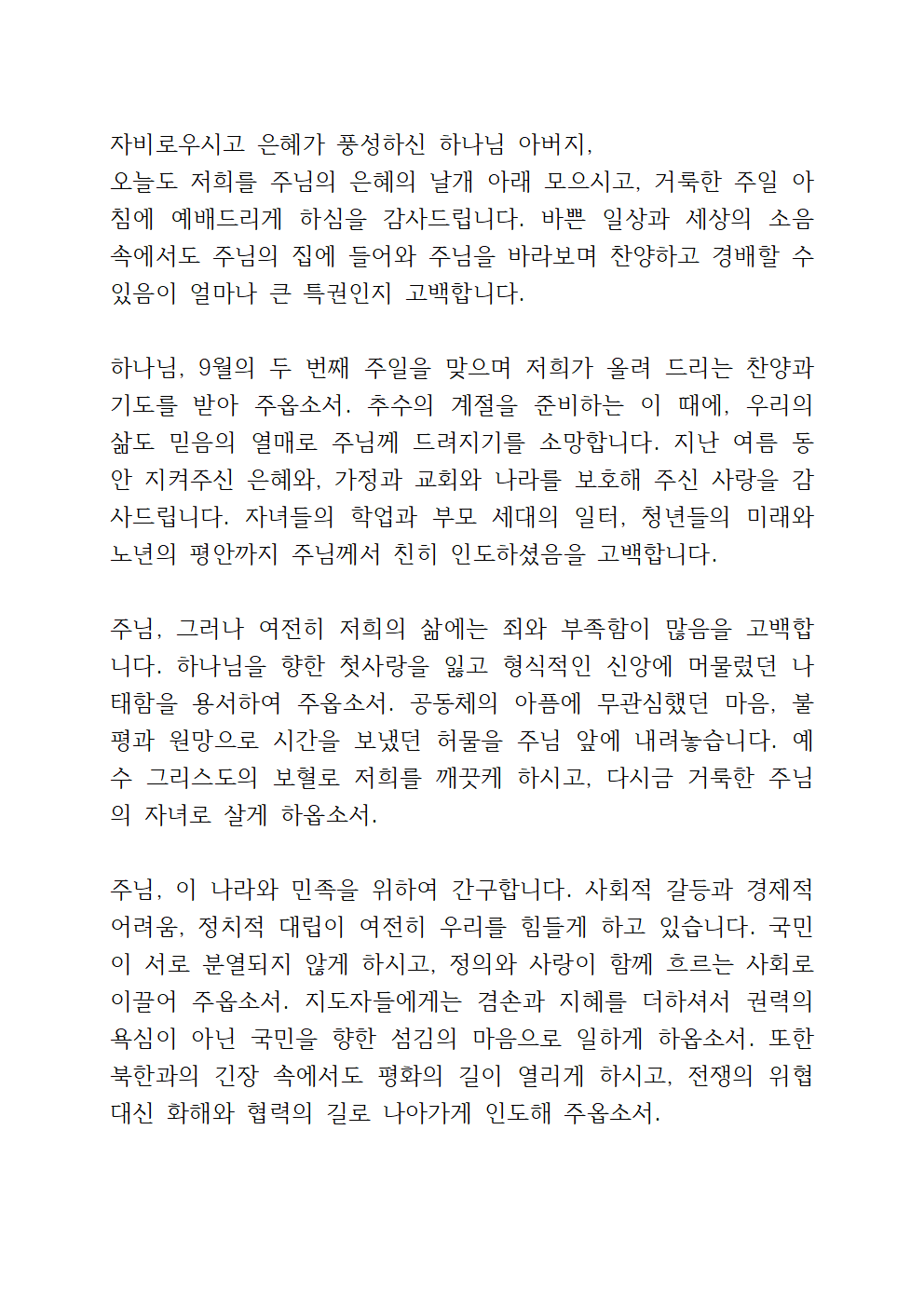 기도문 파일(hwp, pdf)들도 첨부해 드릴테니 9월 둘째주일 대표기도 시 아래의 기도문들을 잘 참고해서 함께 기도해 보세요.~!!