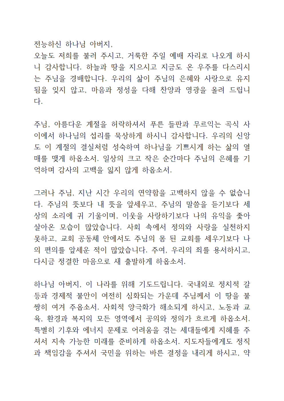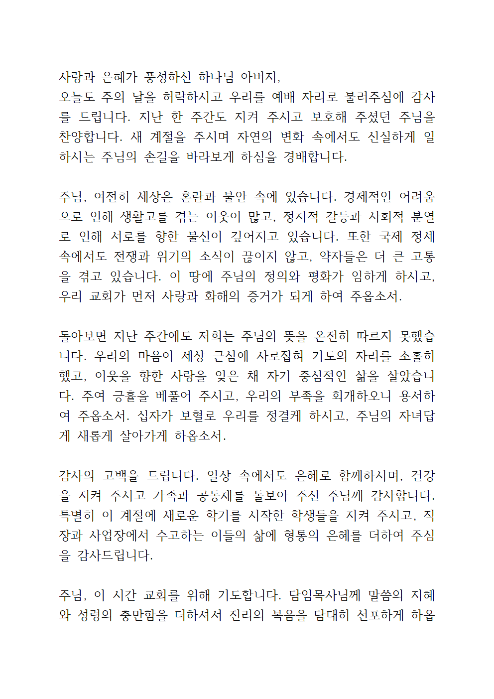 주님, 지난 한 주간도 연약하고 부족한 저희를 지켜 주시고, 일상 가운데 베푸신 은혜와 자비를 기억하며 감사를 드립니다. 건강을 지켜 주신 것, 가족과 교회를 지켜 주신 것, 나라와 사회가 큰 혼란 중에도 여전히 주님의 손에 붙들려 있음을 고백합니다.