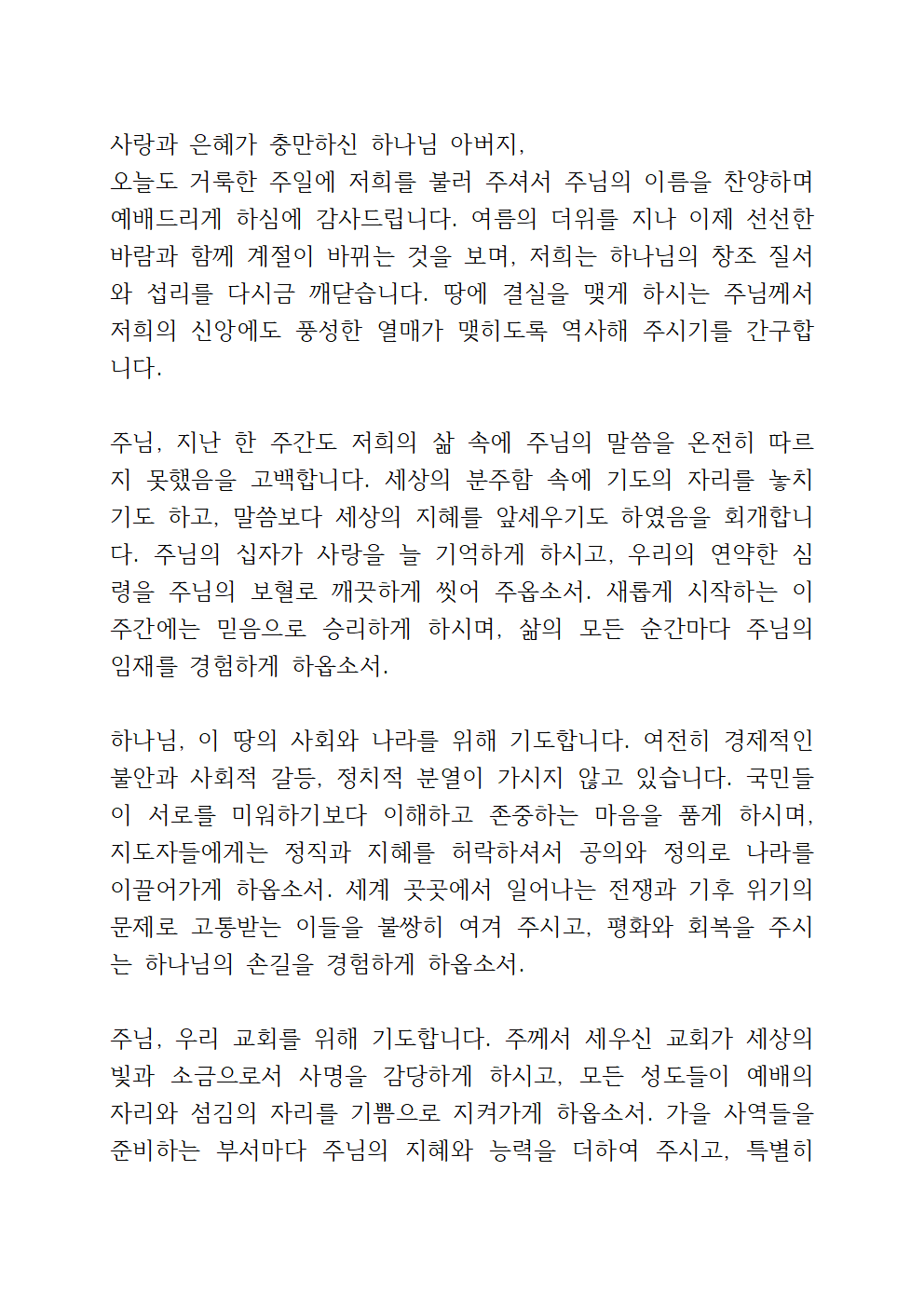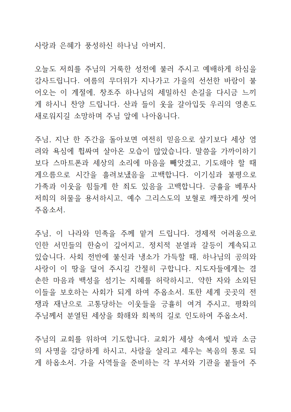 "2025년 9월 둘째 주일 예배 대표기도문 BEST 5"