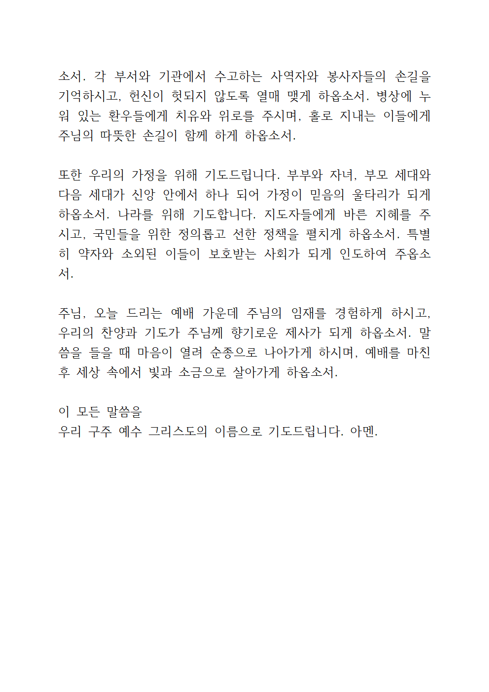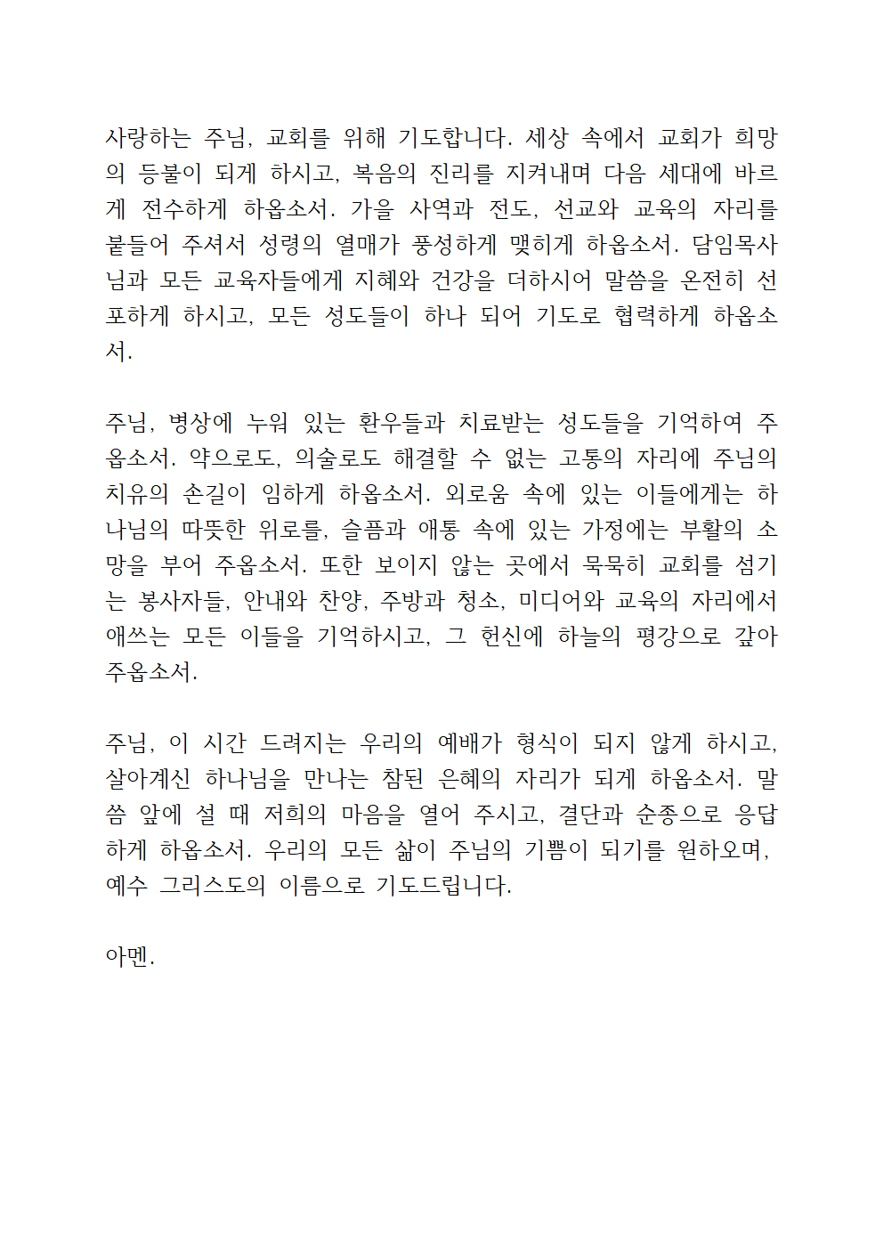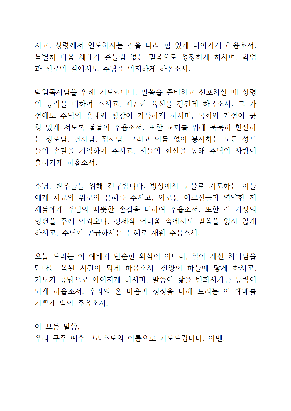 주님, 이 예배 가운데 임재하셔서 우리의 찬양과 기도를 받으시고, 말씀을 통해 우리의 심령이 새로워지게 하옵소서. 이 예배가 우리의 삶을 변화시키며, 세상 속에서 믿음으로 승리하게 하는 힘이 되게 하옵소서.