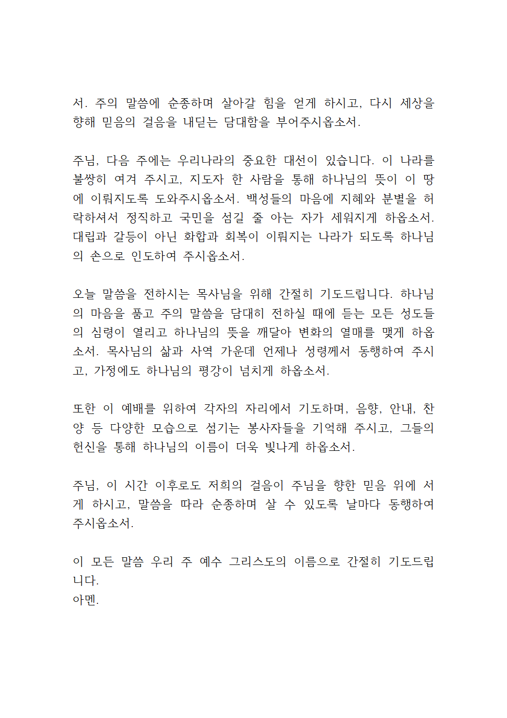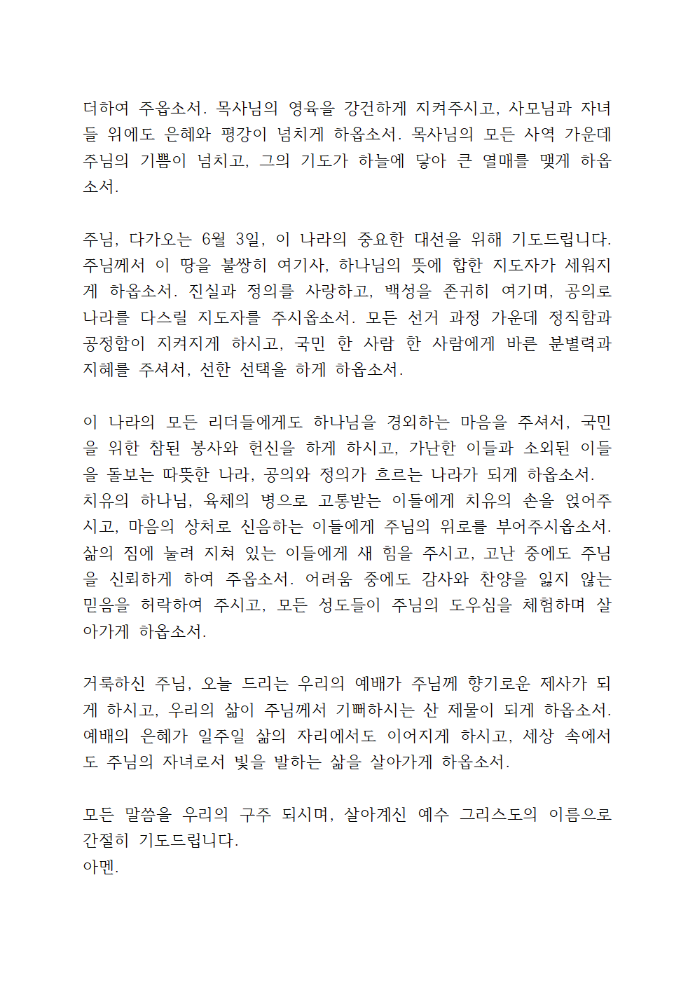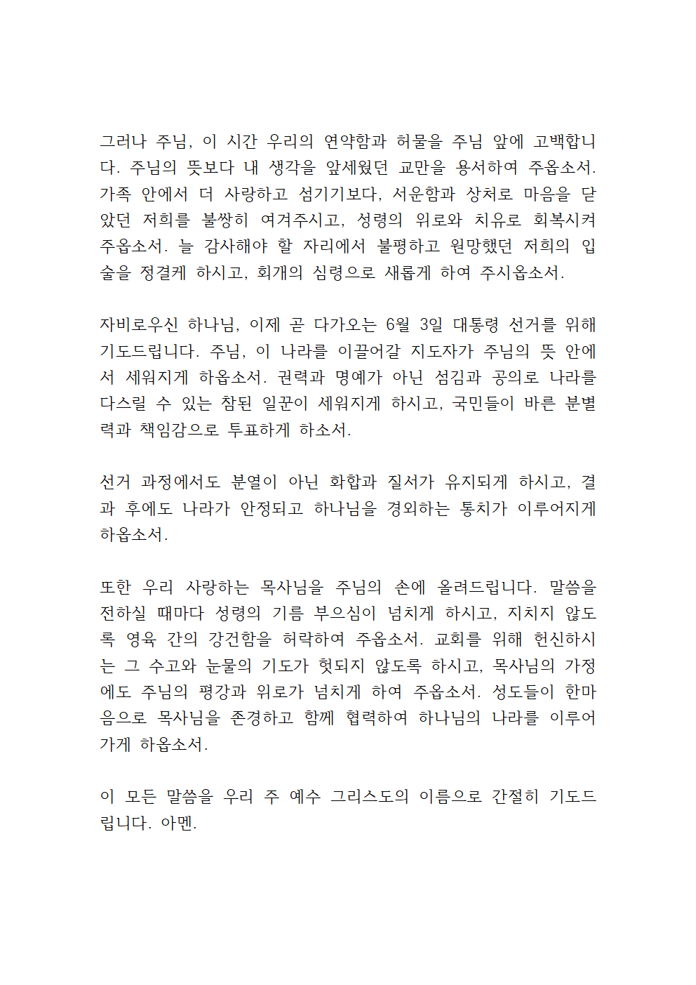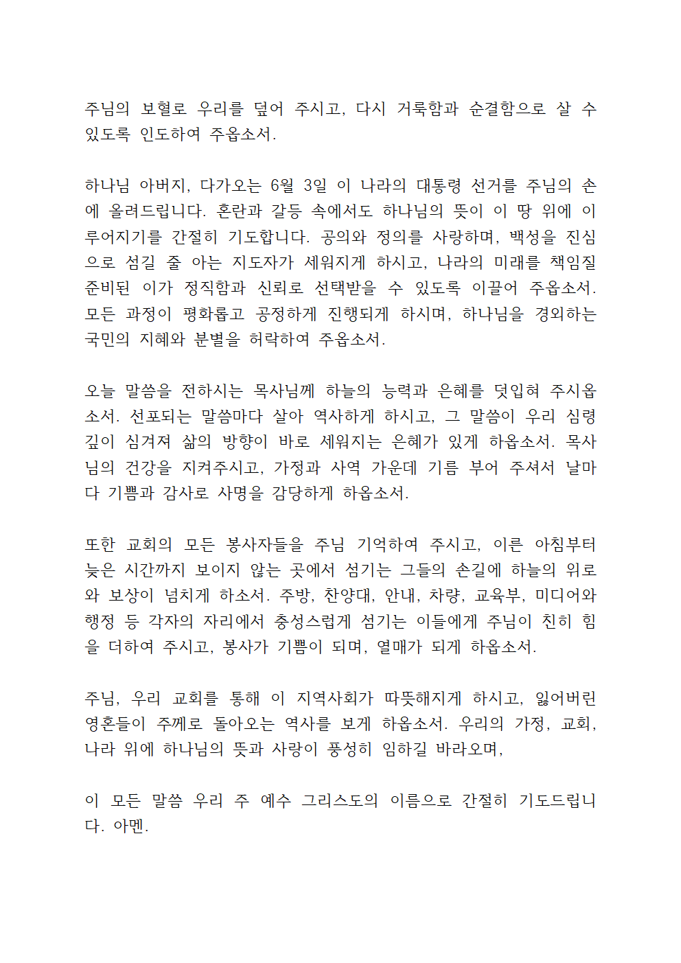 이런 5월을 잘 마무리하게 된 시점에서 하나님 아버지께 감사와 찬양을 올려드리며, 곧 있을 6월 대선을 위한 기도를 이어가면 좋을 것 같습니다.