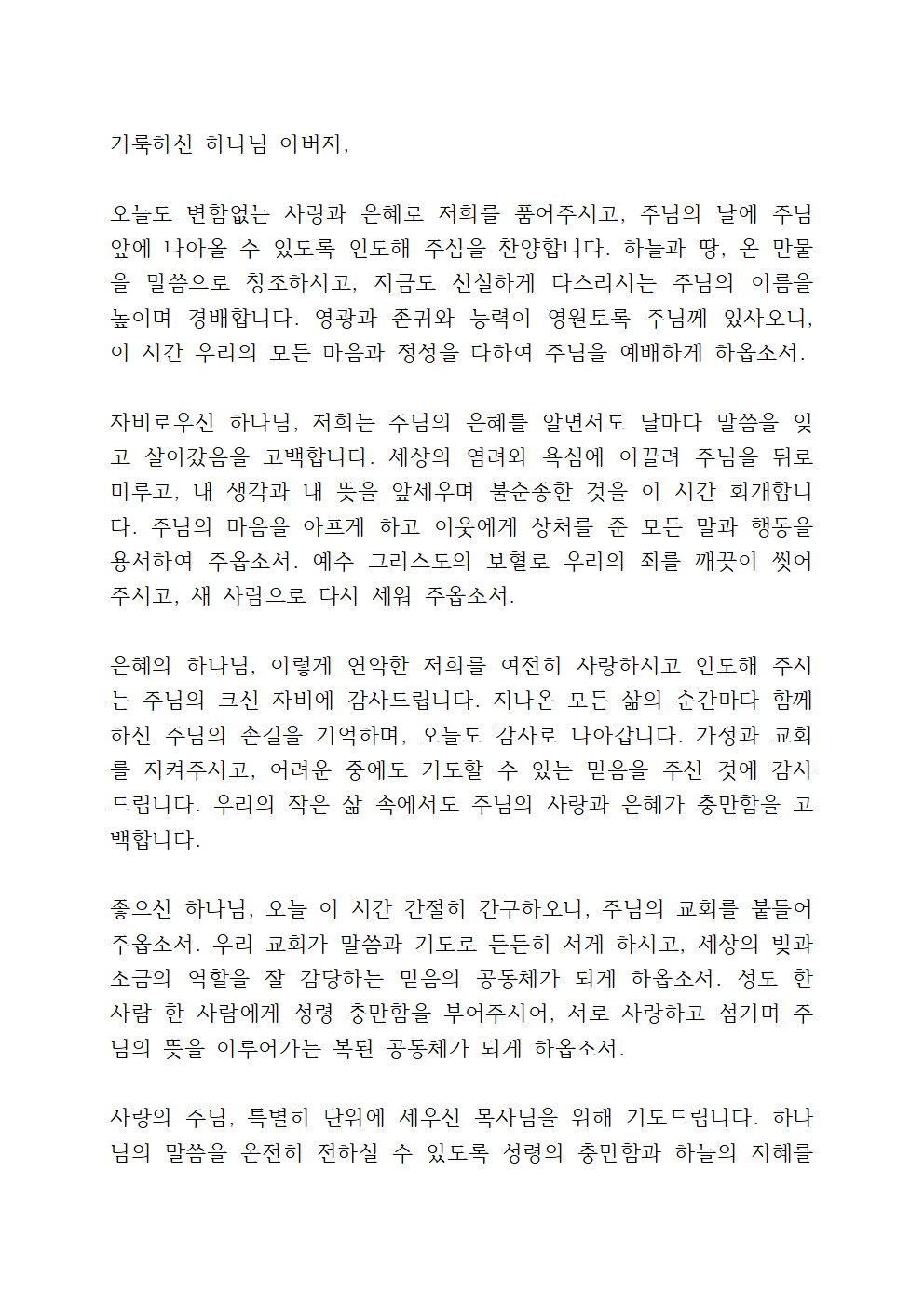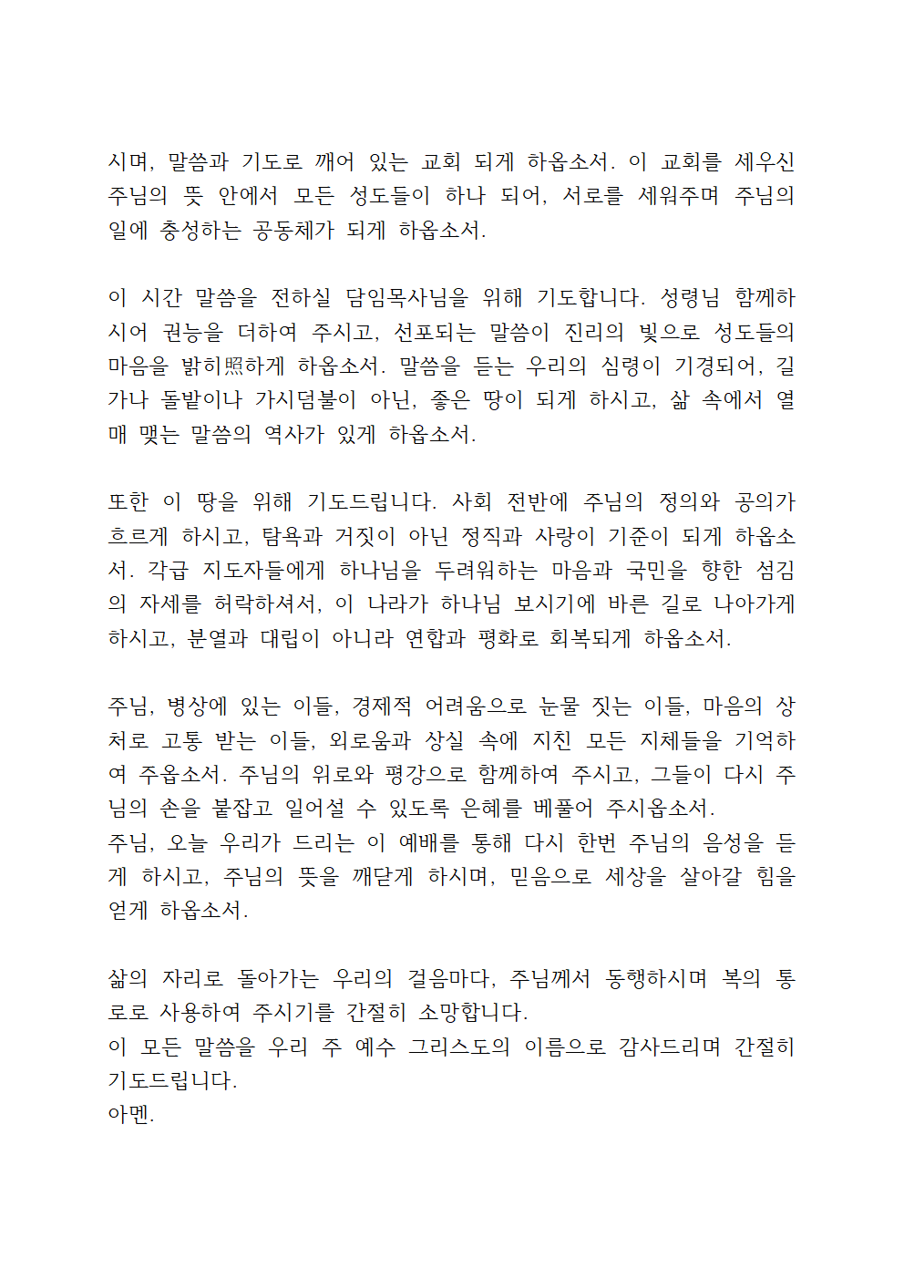 좋으신 하나님, 오늘 이 시간 간절히 간구하오니, 주님의 교회를 붙들어 주옵소서. 우리 교회가 말씀과 기도로 든든히 서게 하시고, 세상의 빛과 소금의 역할을 잘 감당하는 믿음의 공동체가 되게 하옵소서. 성도 한 사람 한 사람에게 성령 충만함을 부어주시어, 서로 사랑하고 섬기며 주님의 뜻을 이루어가는 복된 공동체가 되게 하옵소서.