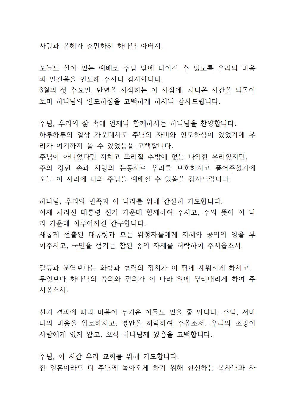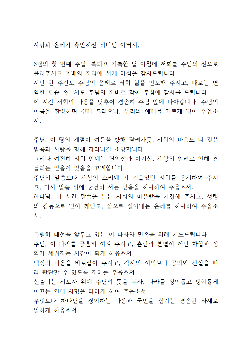 그리고 대선을 바로 코앞에 둔 중요한 시기이기도 합니다. 그렇기에 이번 기도문에서는 나라를 위한 기도와 대선을 위한 기도를 추가해서 기도하면 좋을 것입니다.