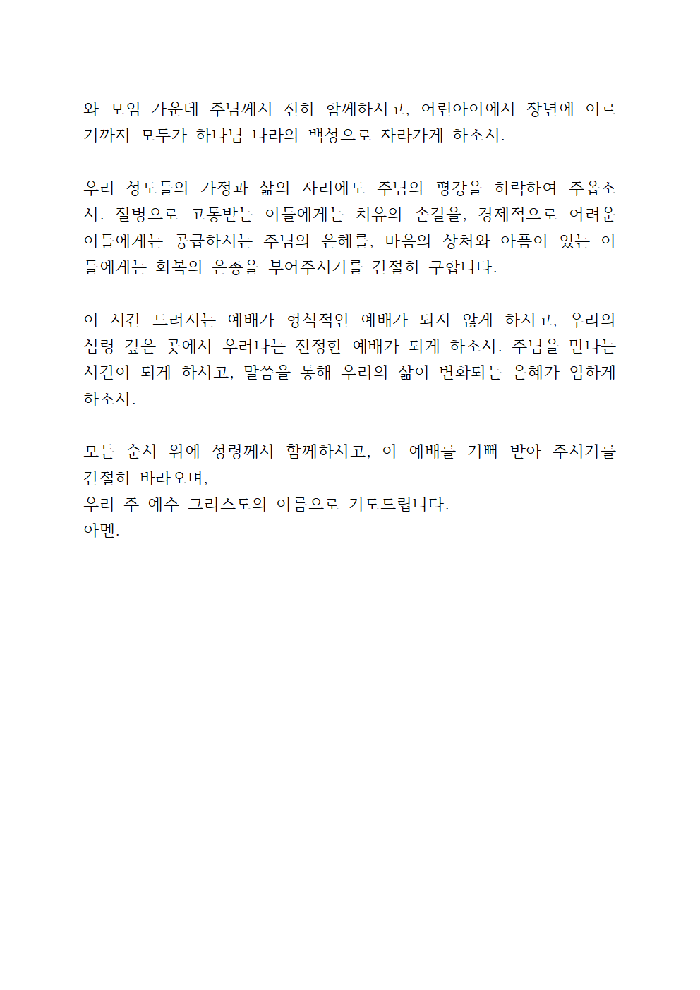 또한 전쟁과 재난, 질병과 고통 가운데 있는 나라들과 이웃들을 기억하여 주시고, 하나님의 평화가 이 땅 가운데 임하게 하옵소서.