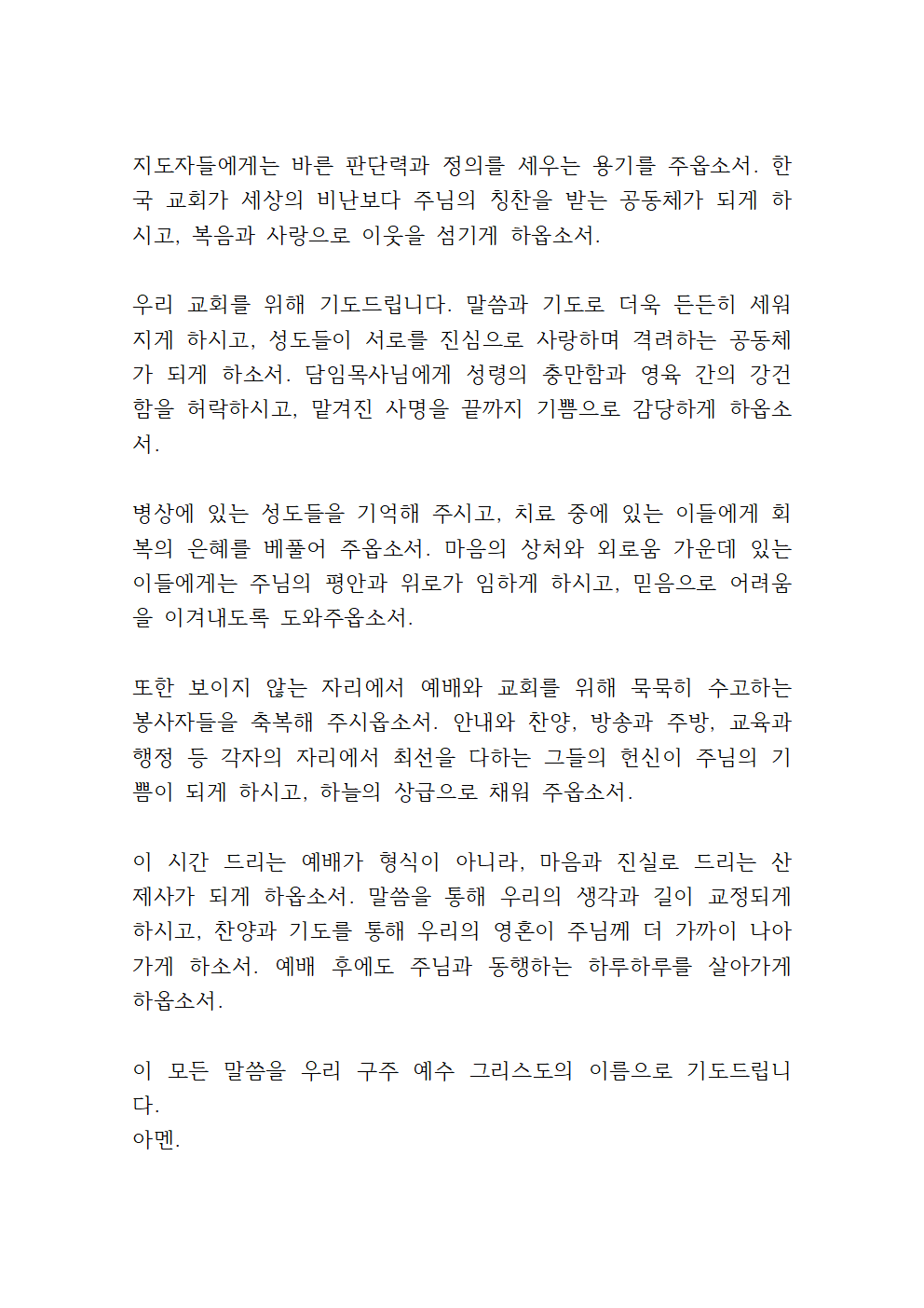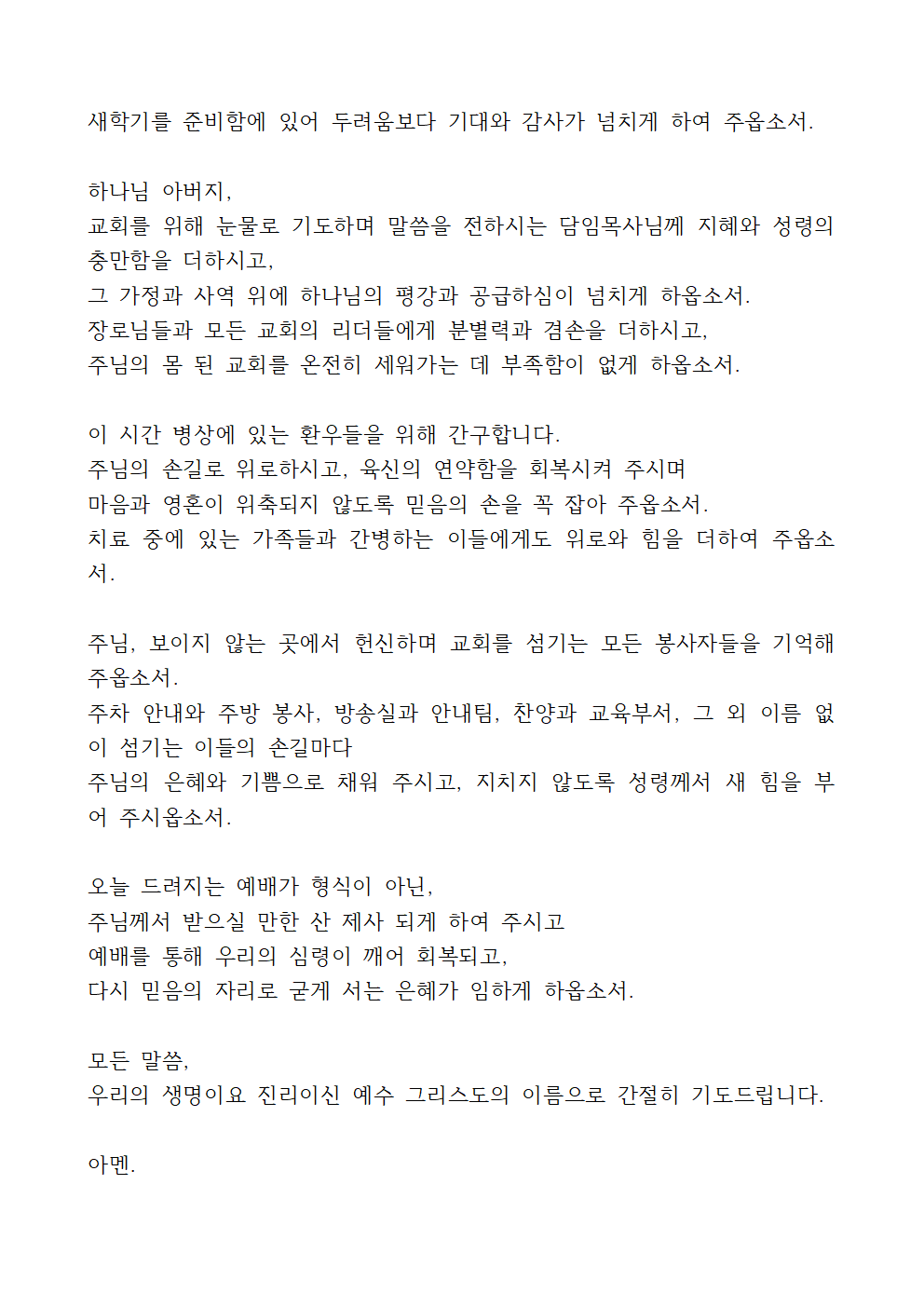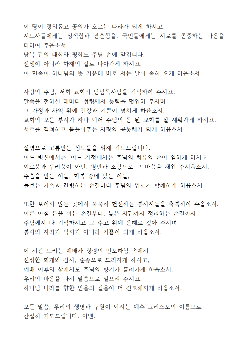 이제 말씀을 전하실 목사님께 성령의 권능을 더하시어 그 말씀이 살아 움직이며 우리의 심령을 새롭게 하게 하옵소서. 예배를 통해 받은 은혜가 주일 하루에만 머무르지 않고 한 주간의 삶 속에서 실천되어 열매 맺게 하옵소서. 가정과 일터, 학업과 사역의 자리마다 주님의 영광과 다스림이 나타나게 하옵소서. 모든 영광과 찬양을 주님께 올려드리며,