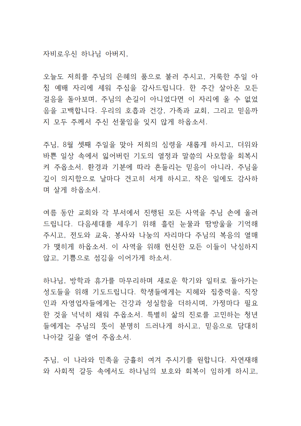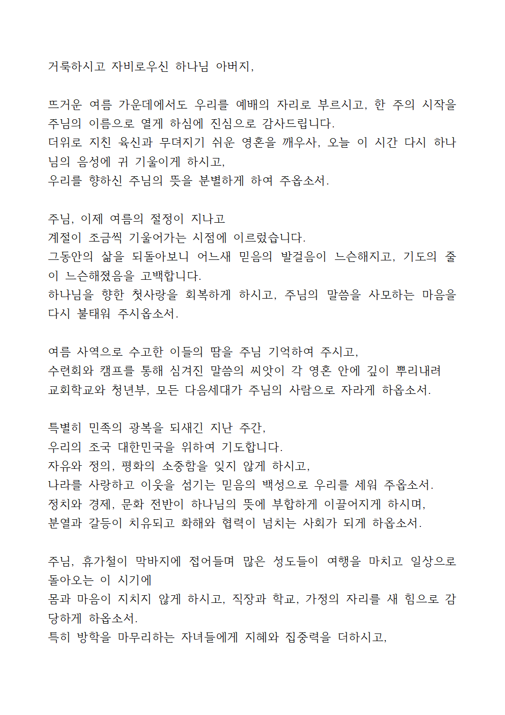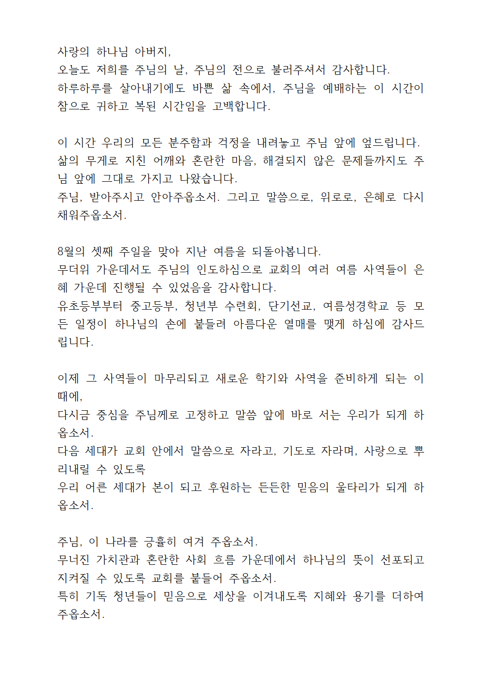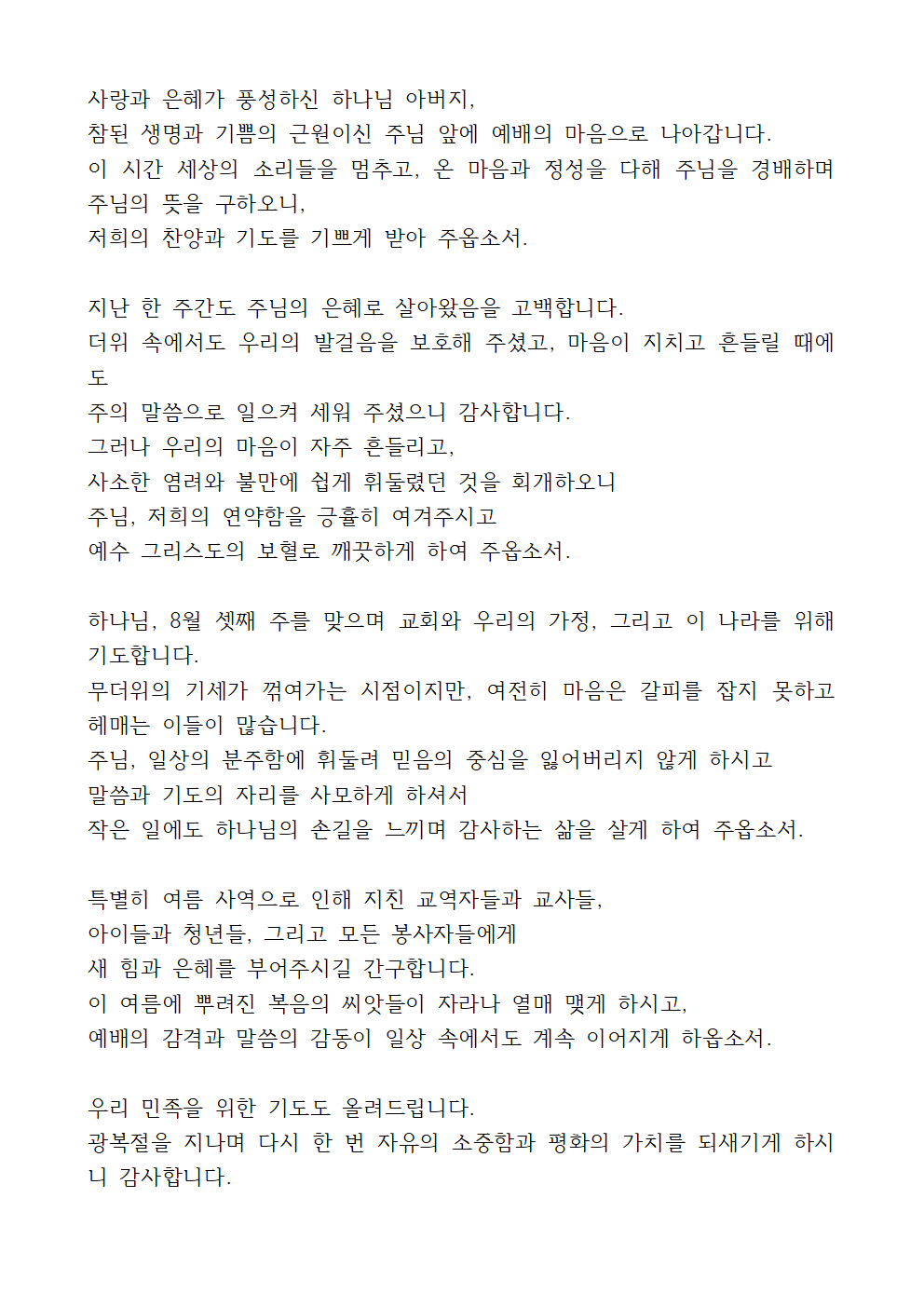 8월 셋째주일은 광복절 이후에 맞이하는 주일이기 때문에 나라와 민족을 위한 기도가 중심이 되면 좋을 것 같습니다.
