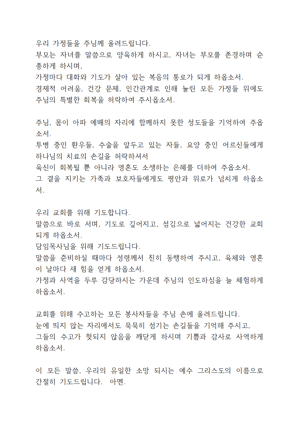 자비로우신 주님, 병상에 있는 환우들과 연로한 어르신들을 위로하시고, 육신의 회복과 마음의 평강을 더하여 주옵소서. 경제적 어려움과 관계의 아픔, 미래의 불안 속에 있는 성도들에게는 하늘의 소망과 담대함을 허락하옵소서. 국내외에서 복음을 전하는 선교사님들과 그 가정을 지켜 주시고, 그들의 사역과 생활에 필요한 모든 것을 넉넉히 채워 주옵소서.